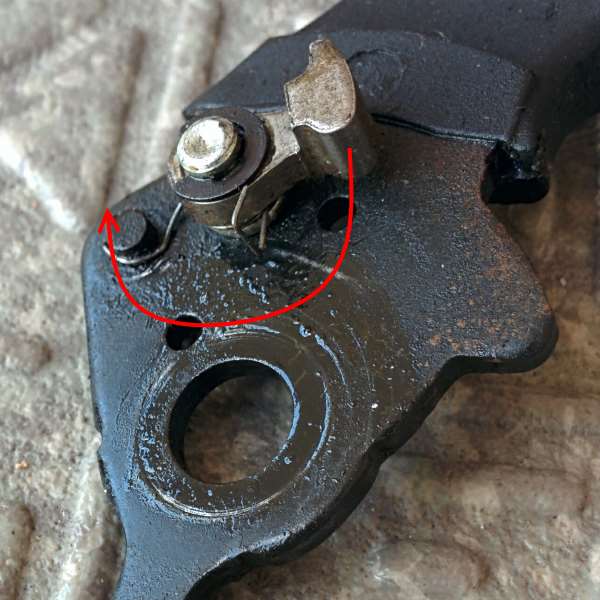 ということで、もとに戻す。ゼンマイバネをレバー側に引っ掛けて、矢印の先まで持っていければOK。