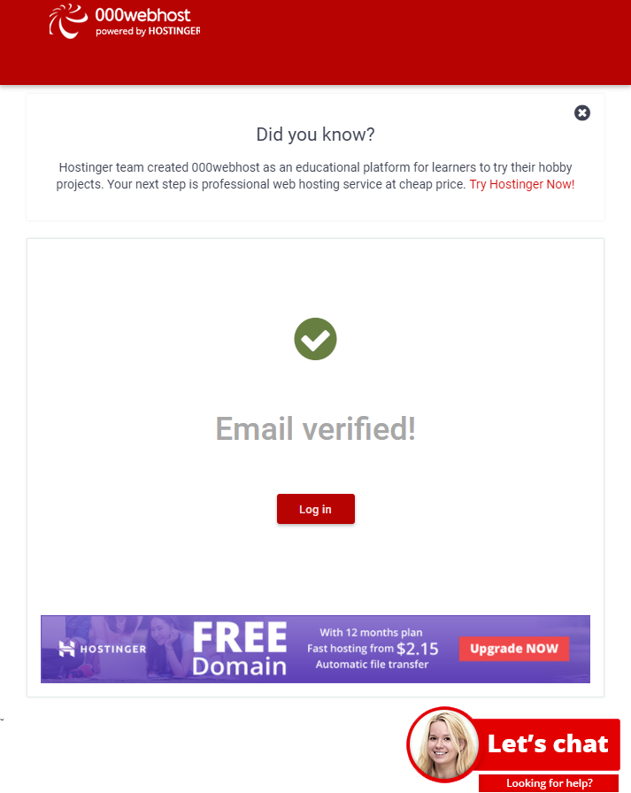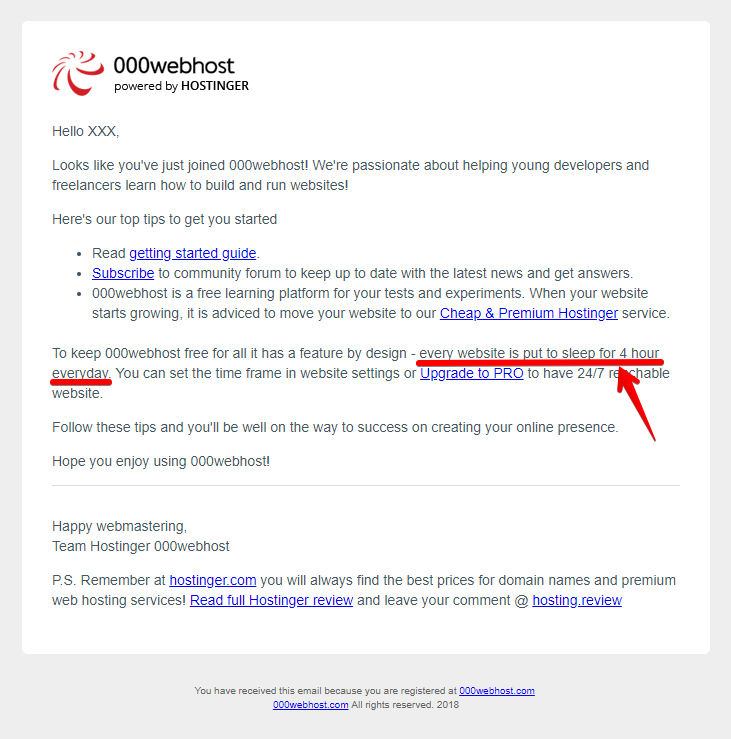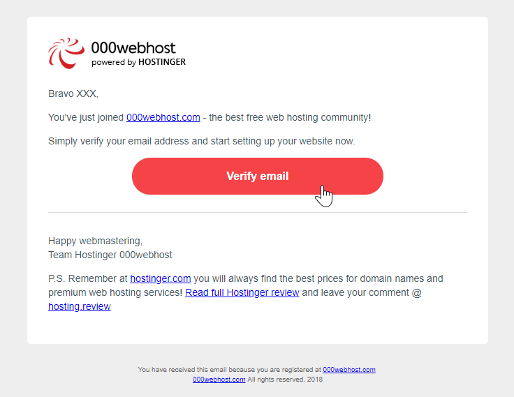 「GET FREE HOSTING」をクリックすると、入力したメールアドレス宛に、次のような確認メールが届きます。