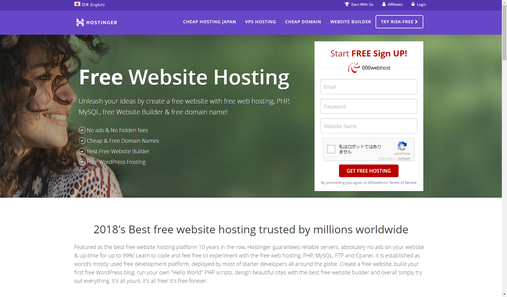 HOSTINGERでは有料でもホスティングのサービスを行っていますが、目的とする無料のホスティングサービスのページを開きましょう。