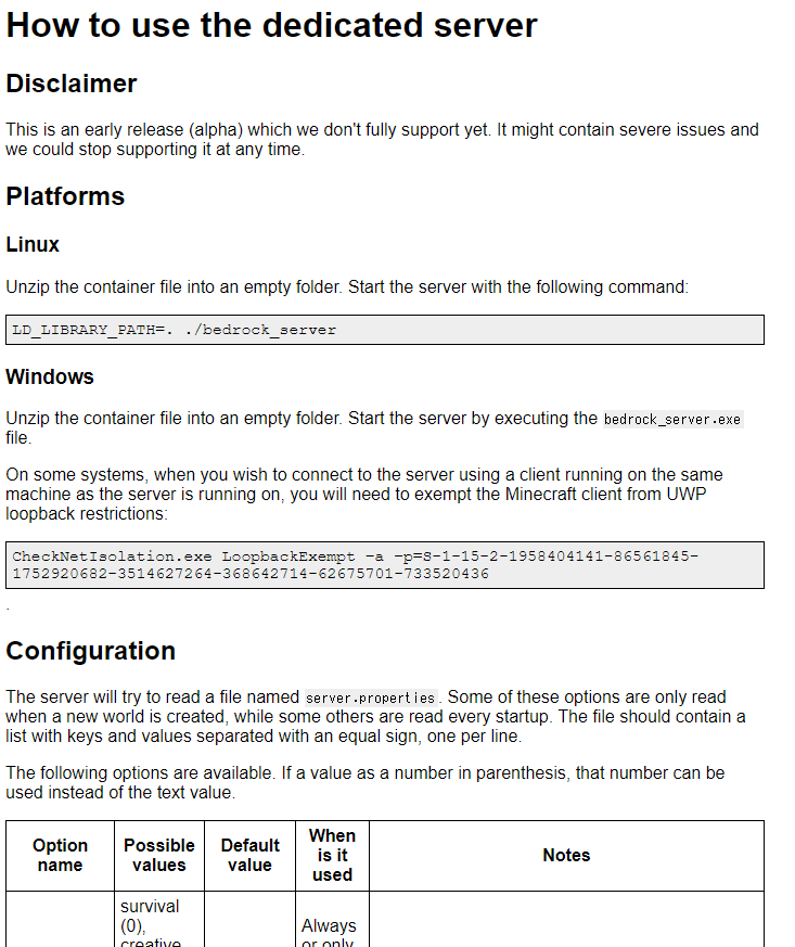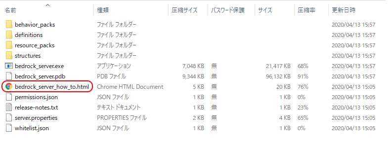 ダウンロードしたファイルをすべて展開したら、フォルダ内のbedrock_server_how_to.htmlを開いて確認。