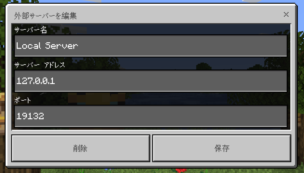 サーバーをインストールしたパソコンから接続するには、外部サーバーのサーバーアドレスとして、「127.0.0.1」を入れれば接続可能。