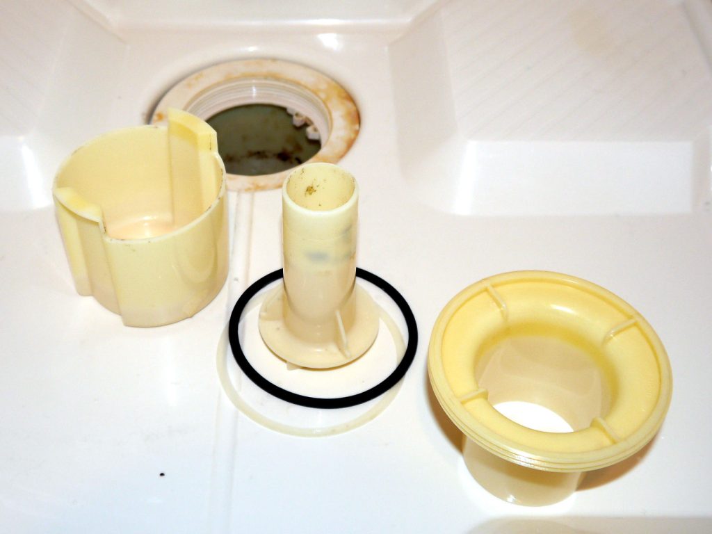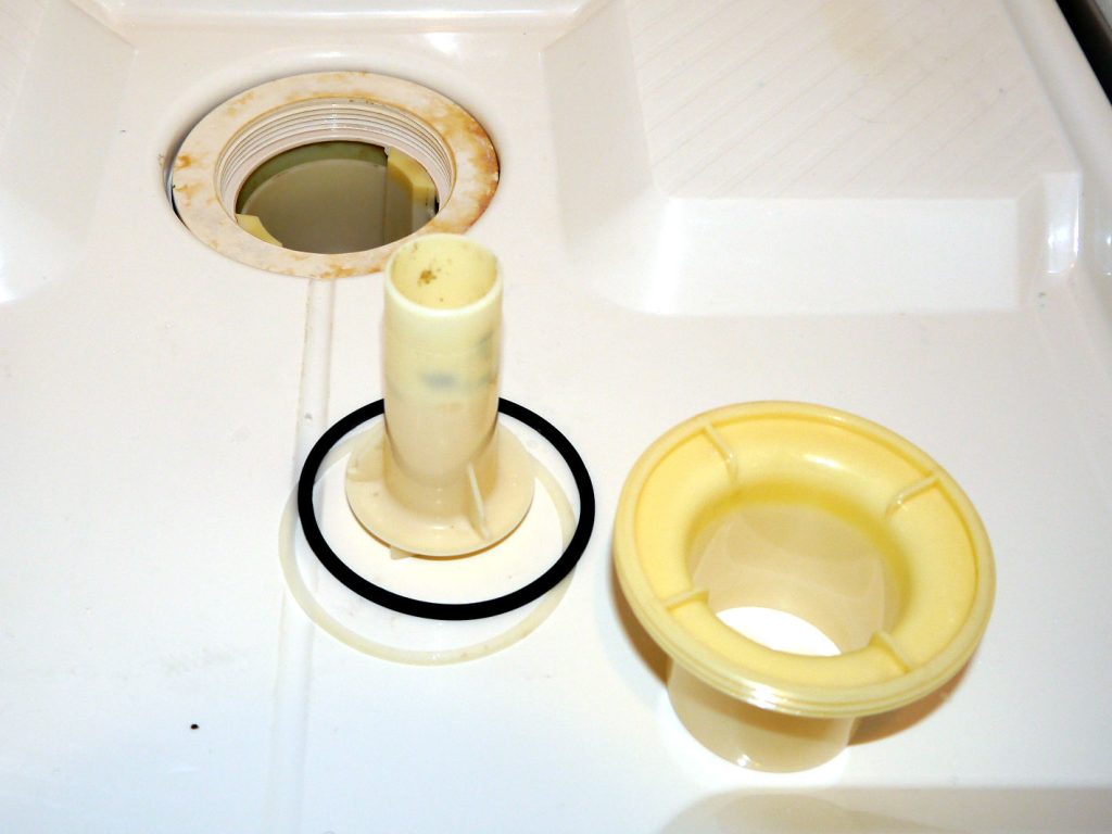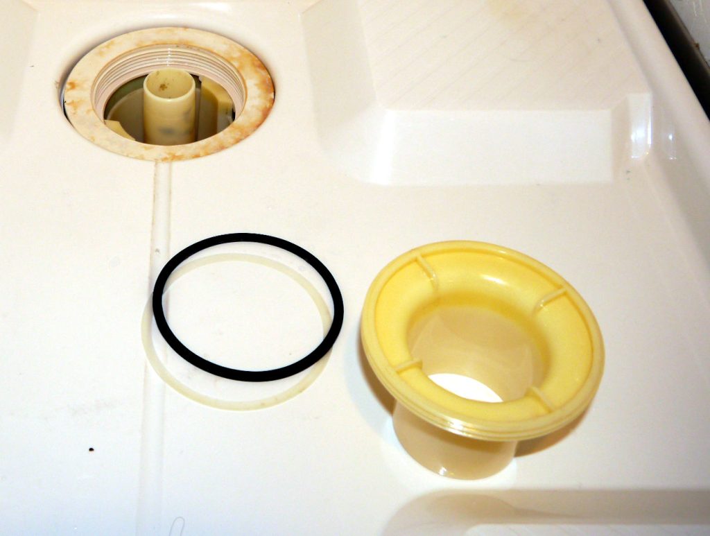 部品が取れると、その下に滑りやすくするための白いパッキンと、ゴムのパッキンがあるので、それも取り除きましょう。組み立てる時は、白いパッキンにシリコンを吹きかけたりしておくと良いかもしれません。
