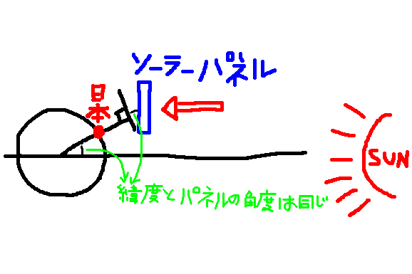 常設型の場合、太陽に向けて設置するほうが、僅かですが発電量は多くなります。理想的な角度は次のように、日本では35度程度が良いでしょう。日頃使わない三角関数が役に立つ数少ない場面ですね。