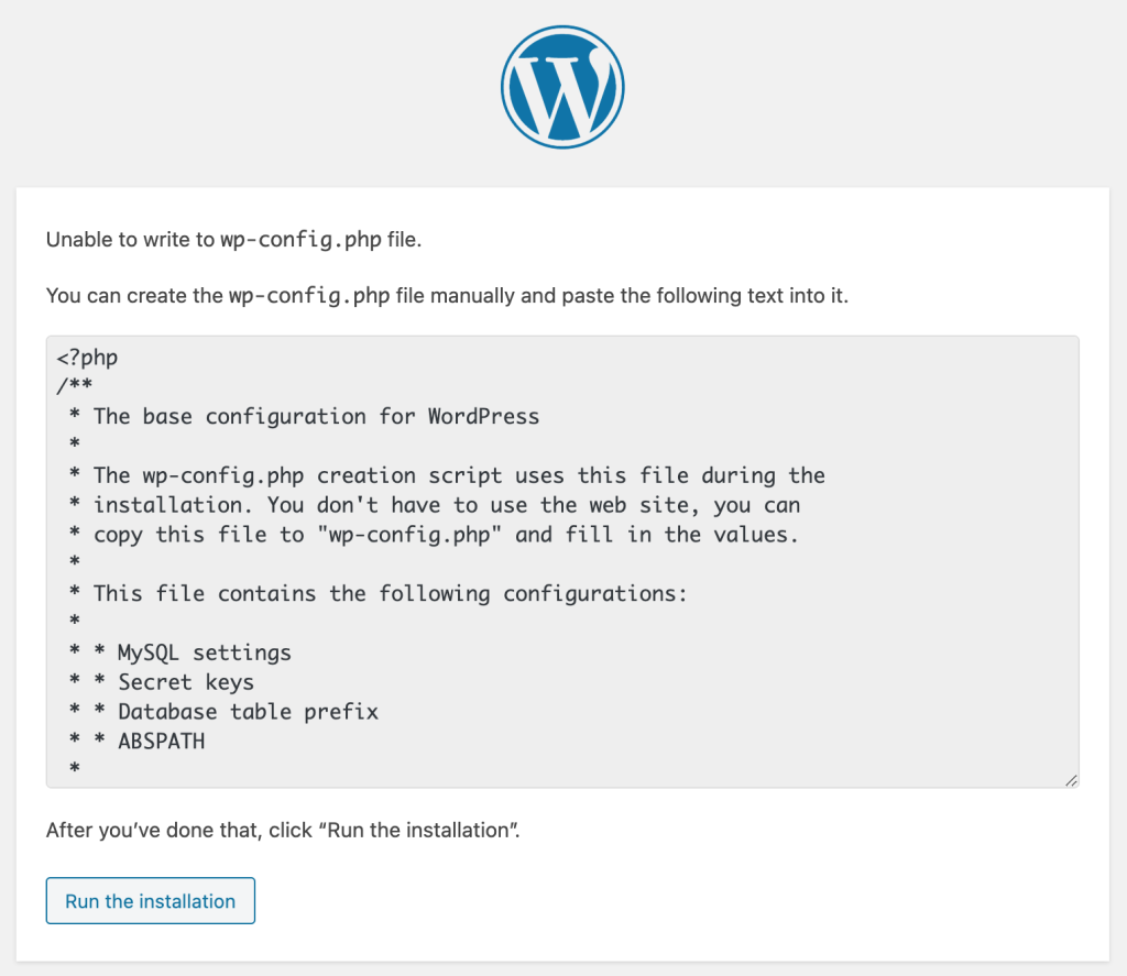 もし、wp-config.phpが書込み可能であれば、自動的に編集されますが、今回は不可能だったため、自分で変更する必要があります。