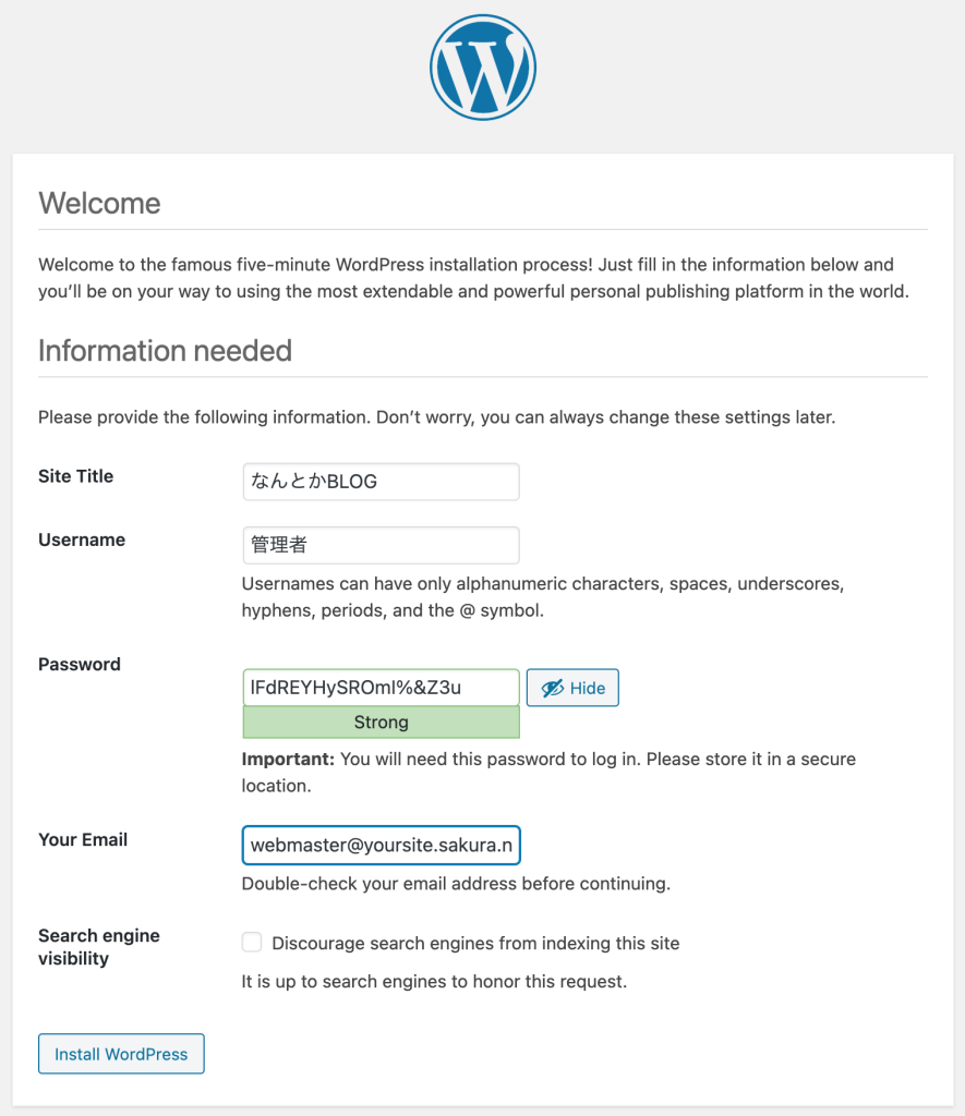 作成するWordPressのサイト情報を入力しましょう。