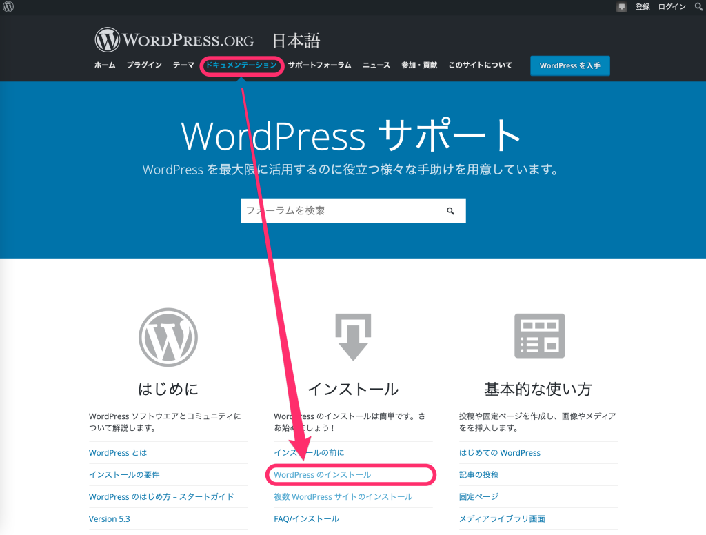 上部メニューの「ドキュメンテーション」をクリックして、「WordPressのインストール」をクリック。