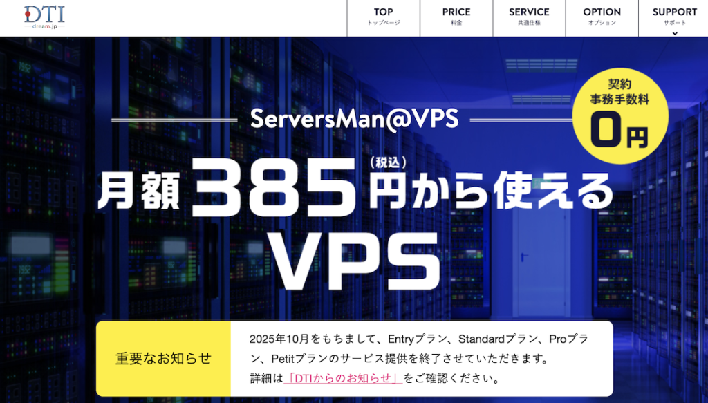 私が利用しているDTI(株式会社ドリーム・トレイン・インターネット)のVPS(Virtual Private Server)が、2025年10月にサービスを終了する予定です。
