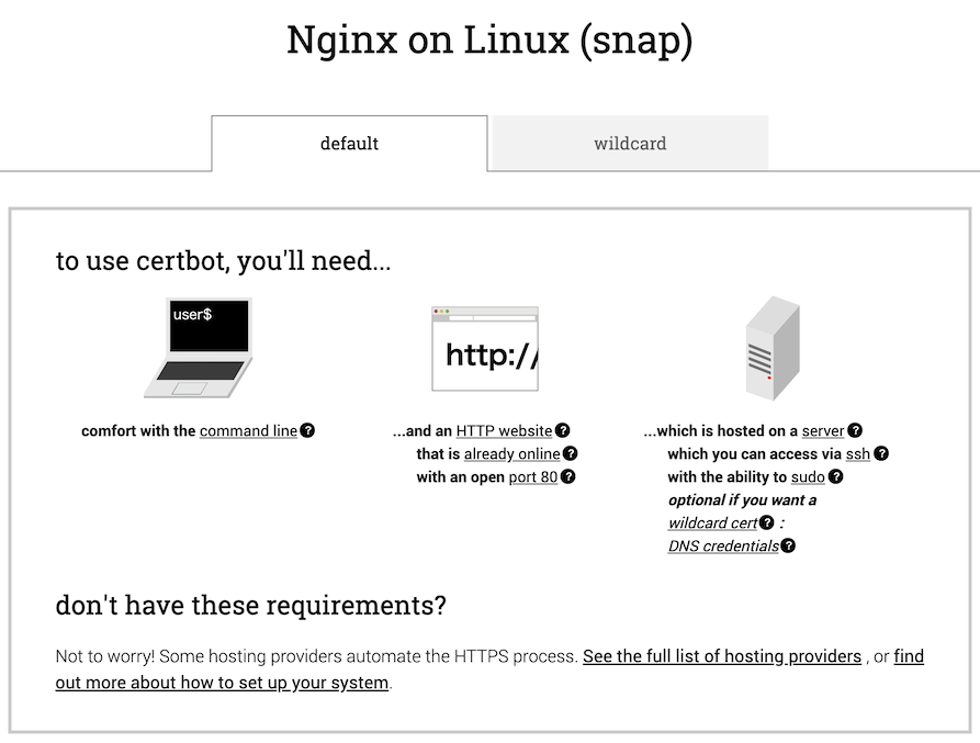 Certbot Instructionsページで、NginxとLinux (snap)を選択すると、手順が表示される。