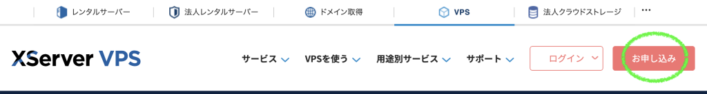 まず、XServer VPSの公式サイトにアクセスし、「お申し込み」を選択します。