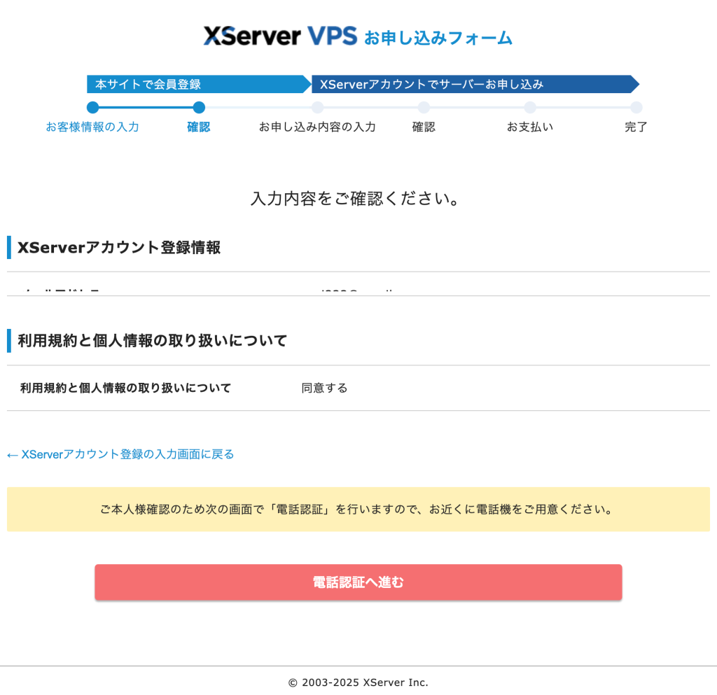入力した内容を確認し、「電話認証へ進む」を選択します。