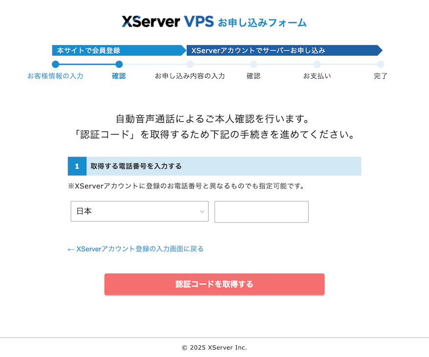 音声通話による認証が行われますので、指示のある番号を入力し、「認証してサーバー申し込みに進む」を選択します。