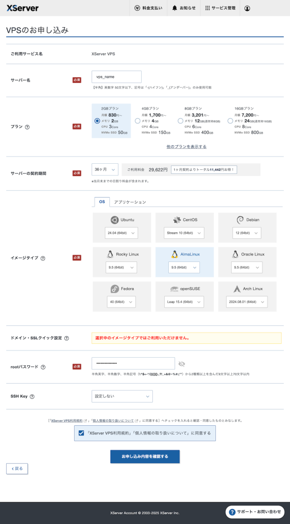 契約するVPSのサーバー名、プラン、契約期間、OSなどを選択し、「お申し込み内容を確認する」を選択します。