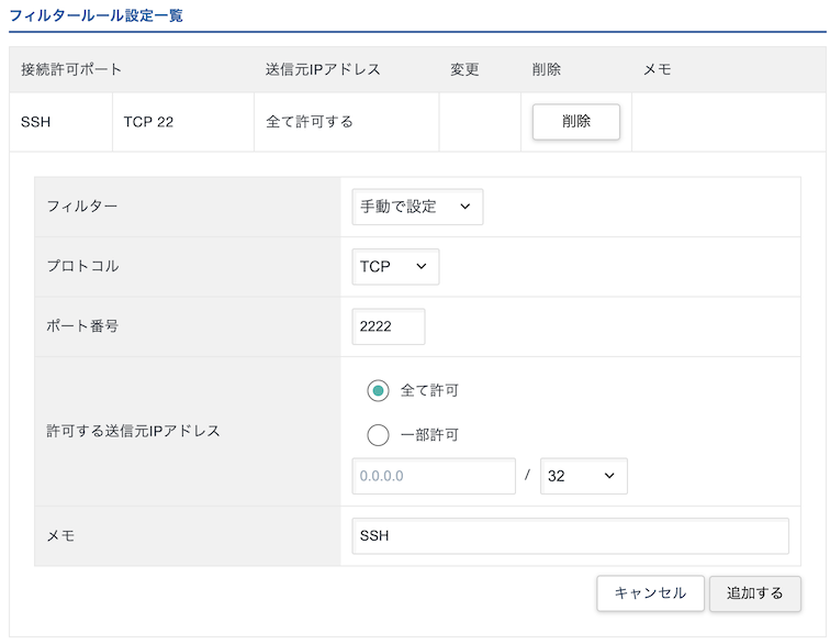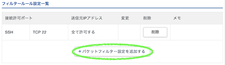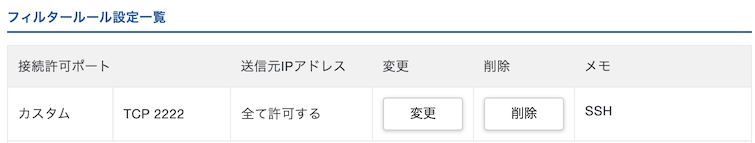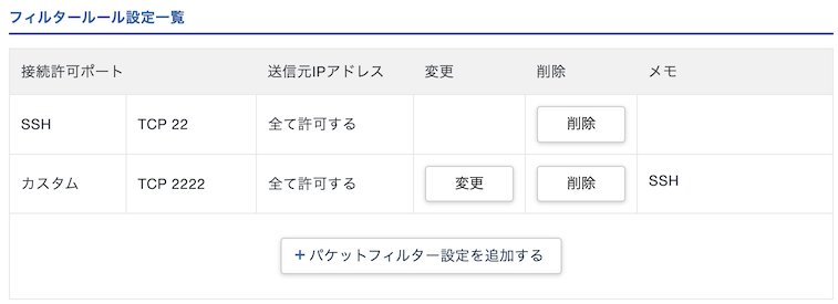 まず、VPS パネルの「パケットフィルター設定」で、変更後のポート番号を通信可能にする。