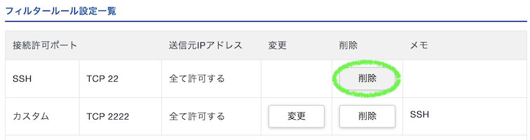 VPS パネルの「パケットフィルター設定」で、変更前のポートを閉鎖する。