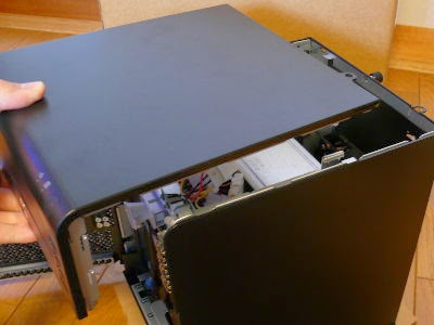 更に、上蓋を取る。後ろのネジをグリグリ外して、上蓋を前面にスライド。