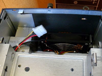取り外したら上面に設置。でも、電源のコネクタが4pin(大)オス型で、変換が必要。SATA 15pinメスへの変換が必要だ。あと、SATAのケーブルも必要。