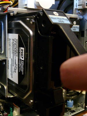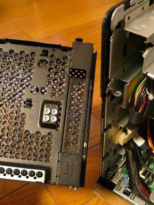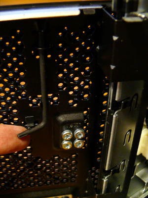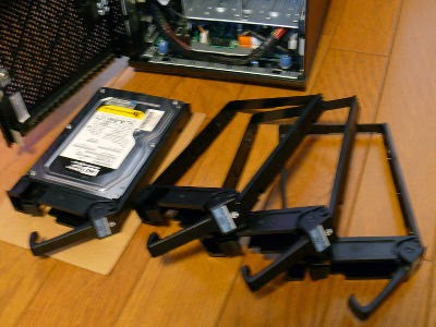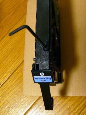 さて、HDD本体を枠から取り外す。工具は、前面扉の裏に付いている。う〜ん。親切!!