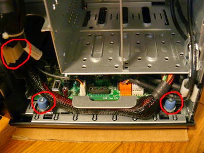 左の赤丸の部分に、ケーブルを止める金具があるので、外す。